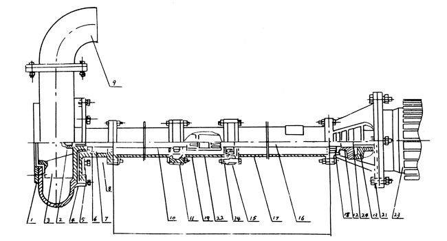 本泵系單級(jí)單吸立式離心泵,流體沿泵軸的軸線成70°方向流出,主要部件有蝸殼、葉輪、泵座、泵殼、支撐筒、電機(jī)座、電動(dòng)機(jī)等。蝸殼、泵座、電機(jī)座、葉輪螺母是生鐵鑄造,耐磨性、耐腐蝕性較好,加工工藝方便。