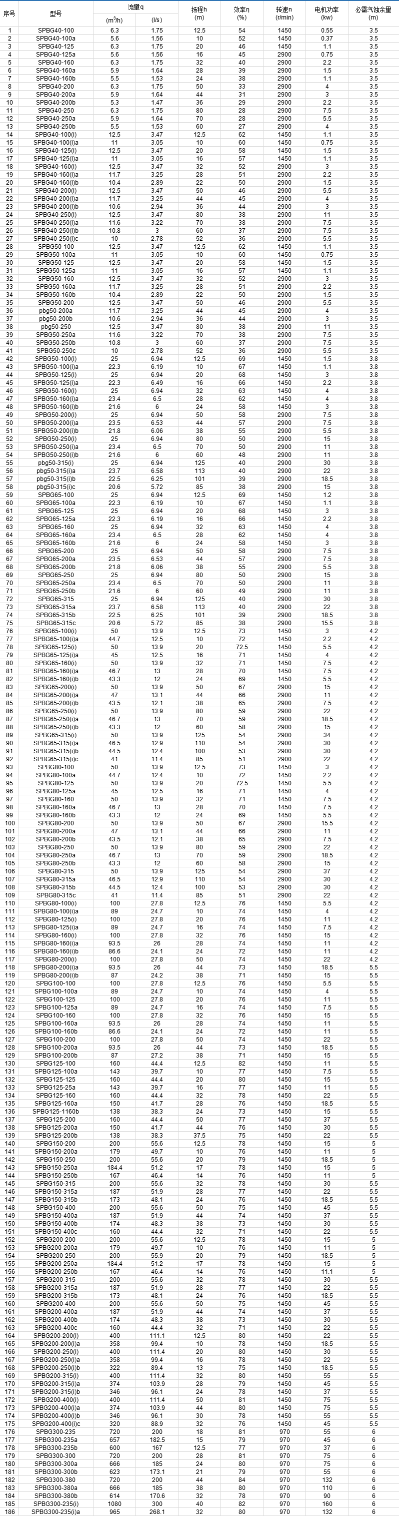 SPBG型屏蔽式管道泵,吸收了國際上屏蔽泵設(shè)計及制造的先進技術(shù),將電機的屏蔽技術(shù)應(yīng)用于流體輸送領(lǐng)域,為適應(yīng)國內(nèi)市場需求而最新推出的系列化新產(chǎn)品。 SPBG型屏蔽式管道泵系列性能參數(shù)基本符合國際標(biāo)準(zhǔn)ISO2858及國家標(biāo)準(zhǔn)JB/T6878.2-93的規(guī)定。具有設(shè)計規(guī)范,通用化程度高,結(jié)構(gòu)合理,性能穩(wěn)定,運轉(zhuǎn)低噪音,無振動等顯著特點,是替代常規(guī)臥式離心泵,立式管道泵的理想產(chǎn)品。 全系列共67個品種,184個規(guī)格,其性能范圍:流量6.3~1080m3/h,揚程12.5~125m,配用電機功率0.37~160kw,轉(zhuǎn)速1450r/min和2900r/min。
